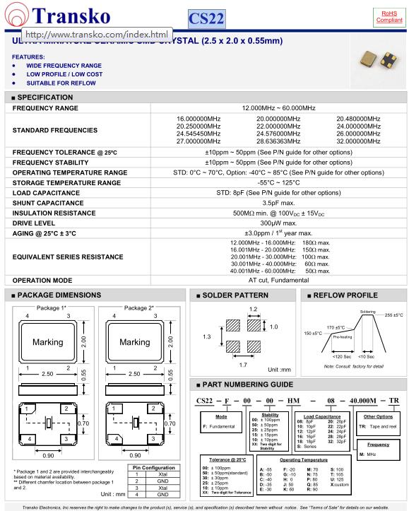 SPECIFICATION-Transko晶振 | CS22晶振 |