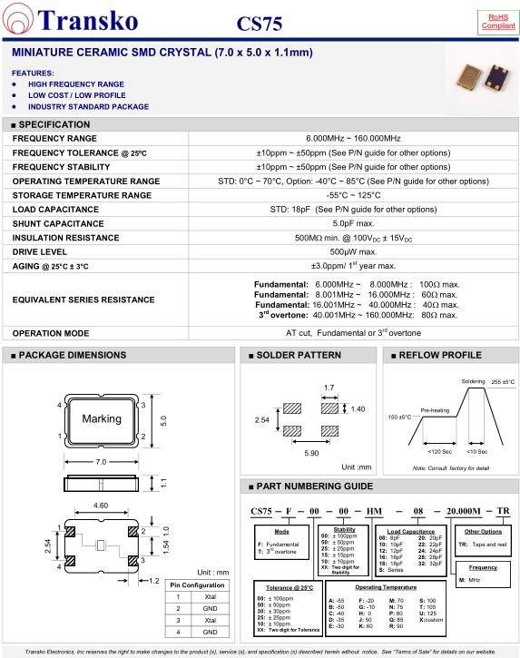 SPECIFICATION-Transko晶振 | CS75晶振 |