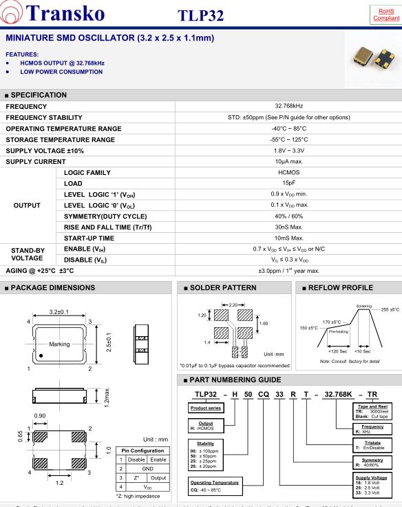 Transko晶振,TLP32晶振,TLP32-H50CQ33RT-32.768K-TR晶振,32.768K時鐘晶體具有小型,薄型,輕型的貼片晶振表面音叉型晶體振蕩器,產品具有優良的耐熱性,耐環境特性,可發揮晶振優良的電氣特性,符合RoHS規定,滿足無鉛焊接的高溫回流溫度曲線要求,金屬外殼的封裝使得產品在封裝時能發揮比陶瓷振蕩器外殼更好的耐沖擊性.