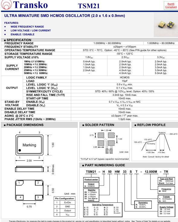 Transko晶振,TSM21晶振,TSM21-H50HM33ST-12.000-TR晶振,小型SMD有源晶振,從最初超大體積到現在的7050mm,6035mm,5032mm,3225mm,2520mm體積,有著翻天覆地的改變,體積的變小也使產品帶來了更高的穩定性能,接縫密封石英晶體振蕩器,精度高,覆蓋頻率范圍寬的特點,SMD高速自動安裝和高溫回流焊設計,Optionable待機輸出三態輸出功能,電源電壓范圍:1.8V~5V,高穩定性,低抖動,低功耗,主要應用領域:無線通訊,高端智能手機,平板筆記本WLAN,藍牙,數碼相機,DSL和其他IT產品的晶振應用,三態功能,PC和LCDM等高端數碼領域,符合RoHS/無鉛.