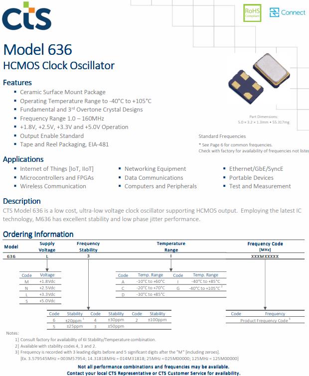 636L3I001M00000 | CTS振蕩器 | 636 | 1MHz | ±50ppm |