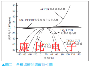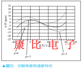 4.溫度特性的管理較易.ATCUT依據切割角度的不同會影響晶振溫度特性.從角度上加以控制,就可得到預期的溫度特性.輪廓與Bending必須要求切割角度以及晶片外型尺寸的邊比管理,在處理上則較為繁雜.圖四為切斷角度與溫度特性圖.