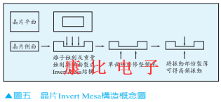 5.可以做到高頻化.ATCUT的振動頻率由厚度決定,因此加工技術的進步可以使厚度更薄,也能使振動的石英晶體諧振器頻率提高.現在已經知道基本波動可以達到600MHz.由剛剛提到的厚度公式計算,可以得到約2.8µm.圖五為InvertMesa型高頻化概念圖.