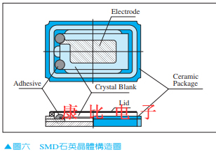 6.機械性強度優異.由於ATCUT是厚度振動,因此晶片的外緣可堅固地加以固定.外型與Bending在外緣部份會振動,因此晶片的中心部份(Node)須以細線支撐,要堅固的加以固定是困難的.圖六為SMD石英晶體構造圖.
