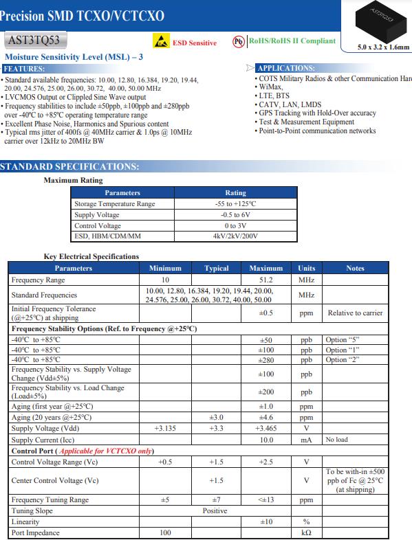 AST3TQ53-V-20.000MHZ-5-SW是一款尺寸為5.0*3.2mm的4-SMD有源貼片晶振,TCXO溫補晶振,頻率20MHz,輸出LVCMOS,電壓 3.3V,標準可用頻率:10.00,12.80,16.384,19.20,19.44,20.00, 24.576, 25.00, 26.00, 30.72, 40.00, 50.00 MHz,LVCMOS輸出或剪切正弦波輸出,頻率穩定性包括±50ppb,±100ppb和±280ppb,超過-40ºC至+85ºC的工作溫度范圍,良好的相位噪聲,諧波和雜散含量,典型的rms抖動400fs @ 40MHz載波和1.0ps @ 10MHz載波超過12kHz至20MHz BW