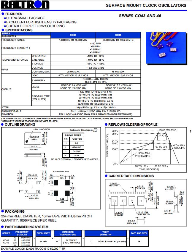 CO43 系列 28.322 MHz 5 x 7 x 1.8 mm 3.3 V ±50 ppm 表面貼裝 時鐘振蕩器 | ||||||