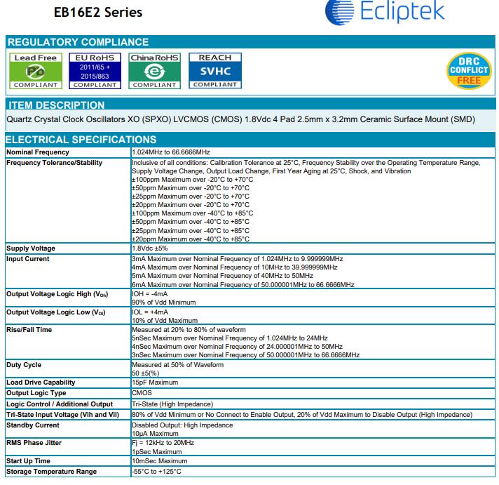EB16K2G2H-32.768K | Ecliptek有源振蕩器 | CMOS | 1.8Vdc | SMD 2.0mm x 2.5mm | ±100ppm | -40°C to +85°C |