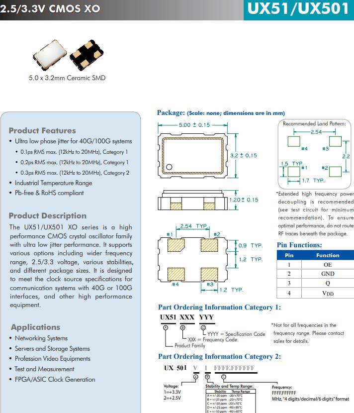 UX51/UX501 XO 系列是具有超低抖動(dòng)性能的高性能CMOS時(shí)鐘振蕩器系列。它支持各種選項(xiàng),包括更寬的頻率范圍、2.5/3.3 電壓、各種穩(wěn)定性和不同的封裝尺寸。它旨在滿足具有 40G 或 100G接口的通信系統(tǒng)以及其他高性能設(shè)備的時(shí)鐘源規(guī)范。
