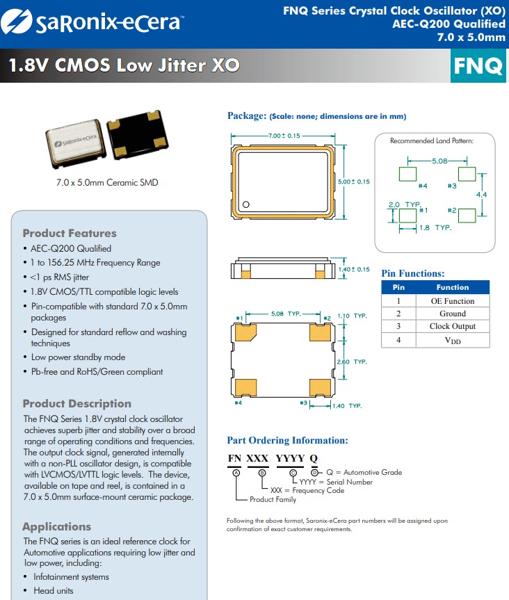 FNQ 1.8V 20~50 7.0 x 5.0 CMOS 1.8 4 1.8V、7.0x5.0mm、汽車級CMOS晶體振蕩器