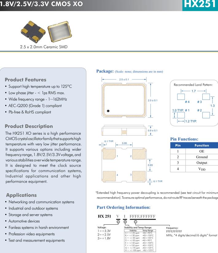HX251 XO系列是高性能的CMOS晶體振蕩器家族,支持高具有極低抖動(dòng)性能的溫度。它支持各種選項(xiàng),包括更廣泛頻率范圍,1.8V/2.5V/3.3V電壓,和在較寬的溫度范圍內(nèi)具有多種穩(wěn)定性。它是為滿足時(shí)鐘源而設(shè)計(jì)的通信系統(tǒng)規(guī)范,工業(yè)應(yīng)用等較高設(shè)備性能。