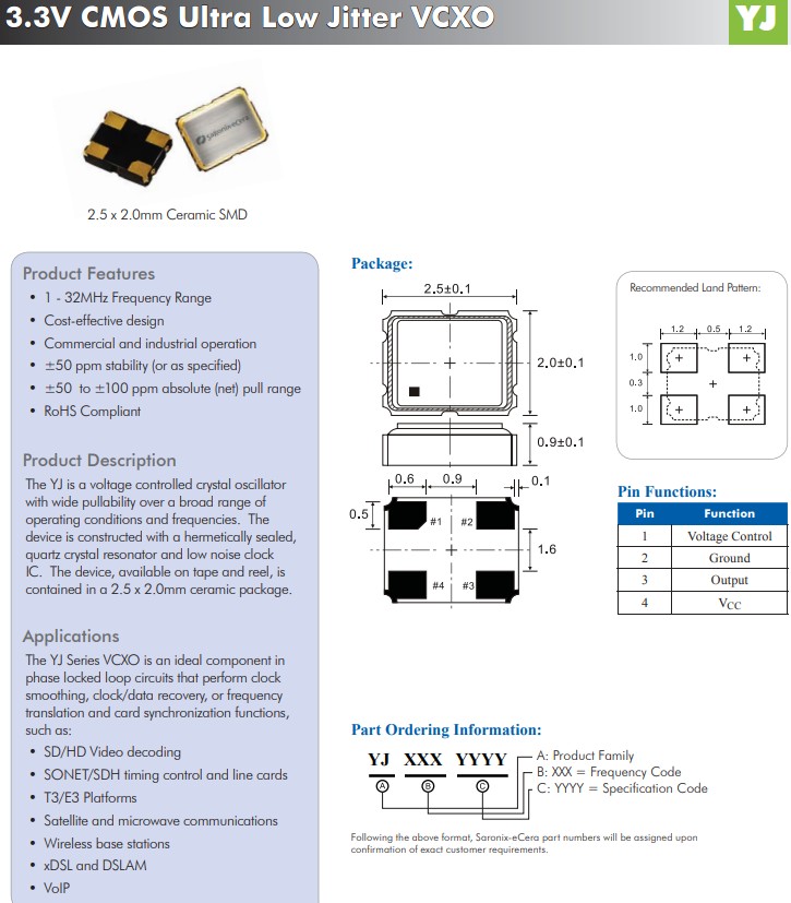 更多>>YJ系列VCXO是頻率轉換和卡同步功能的鎖相環電路中的理想組件