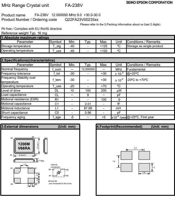 Q22FA23V0023500 | 3.2 x 2.5 x 0.7mm | FA-238V | 12.000000 MHz | 9 pF | +/-30 ppm | +/-30 ppm | -20 to +70 °C |