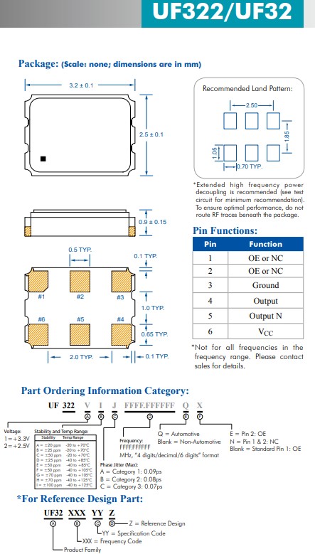 UF322/UF32 XO系列是經過優化的晶體振蕩器系列,UF3221DA0212.500000,低相位抖動晶振,ECERA振蕩器