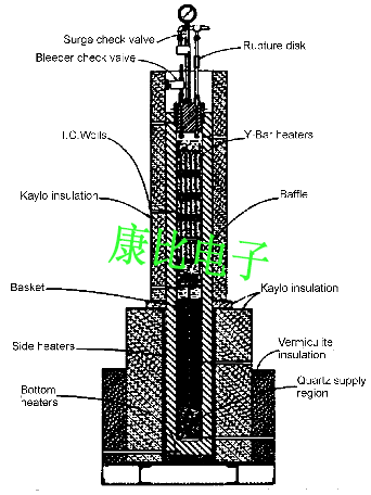 培養(yǎng)的石英在稱(chēng)為高壓釜的大型壓力容器中生長(zhǎng)(參見(jiàn)下面的示意圖).高壓釜是一個(gè)金屬圓筒,一端封閉,能承受高達(dá)30,000磅/平方英寸的壓力,內(nèi)部溫度為700至800°F.它通常高12至20英尺,直徑2至3英尺 將純的但未面對(duì)的石英晶體諧振器中的石英(尺寸為1至1.5英寸)的小碎片(稱(chēng)為“lascas或營(yíng)養(yǎng)物”)放置在金屬絲網(wǎng)籃中并降低到容器的下半部分中.帶有預(yù)先安排的孔的鋼板,稱(chēng)為“擋板”,設(shè)置在籃筐的頂部.擋板用于分離生長(zhǎng)(種子)區(qū)域和營(yíng)養(yǎng)區(qū)域,并幫助建立兩個(gè)區(qū)域之間的溫差.適當(dāng)取向的單晶板(天然的或培養(yǎng)的),稱(chēng)為"種子",安裝在架子上并懸掛在容器上半部的擋板頂部.然后將高壓釜用堿性水溶液(碳酸鈉或氫氧化鈉)填充至其自由體積的約80%,以允許將來(lái)的液體膨脹,并用高壓封閉物密封.然后通過(guò)連接到圓筒外圓周的一系列電阻加熱器使高壓釜達(dá)到工作溫度.隨著溫度升高,壓力開(kāi)始在高壓釜內(nèi)形成.溫度為700至800在容器的下半部分達(dá)到°F,而上半部分保持在比下半部分低70至80°F的溫度.