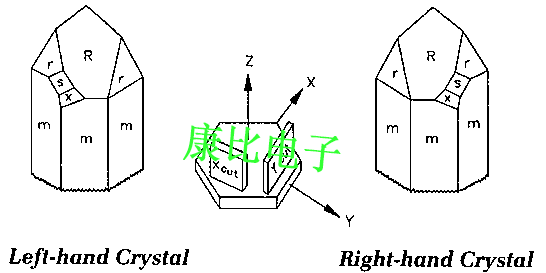 α-石英屬于晶體學(xué)類(lèi)32,它是六角形棱柱,每端有六個(gè)帽面.棱鏡面指定為m面,蓋面指定為R面和r面.R面通常被稱(chēng)為主要菱形面,r面是次要的菱形面.左手和右手晶振都是自然發(fā)生的,可以通過(guò)S面和X面的位置來(lái)區(qū)分. 如上面的示意圖所示,α-石英晶體具有三重對(duì)稱(chēng)的單軸(三角軸),并且它具有與該三角軸垂直的三個(gè)雙重對(duì)稱(chēng)軸(二軸).二維軸間隔120°并且是極軸,也就是說(shuō),可以為它們分配一定的感覺(jué).極軸的存在意味著缺乏中心對(duì)稱(chēng)性,并且是壓電效應(yīng)存在的必要條件.二軸也稱(chēng)為石英電軸(x軸,y軸).在具有完全發(fā)展的自然面的晶體中,每個(gè)極軸的兩端可以通過(guò)S面和X面的存在或不存在來(lái)區(qū)分.當(dāng)在電軸方向上施加壓力時(shí),在由這些面改變的軸的那一端產(chǎn)生負(fù)電荷.三角軸,也稱(chēng)為光軸(z軸),不是極性的,因?yàn)榕c其垂直的二軸的存在意味著三角軸的兩端是等效的.因此,沿光軸不會(huì)產(chǎn)生壓電極化.在直角坐標(biāo)系中,z軸平行于m個(gè)棱鏡面.以其垂直于x軸的主表面切割的石英板稱(chēng)為X切割板.將切割繞z軸旋轉(zhuǎn)90度給出Y切割板,其y軸現(xiàn)在垂直于主表面.由于石英晶體具有六個(gè)棱鏡面,因此x軸和y軸存在三種選擇.選擇是任意的;每個(gè)行為都相同.