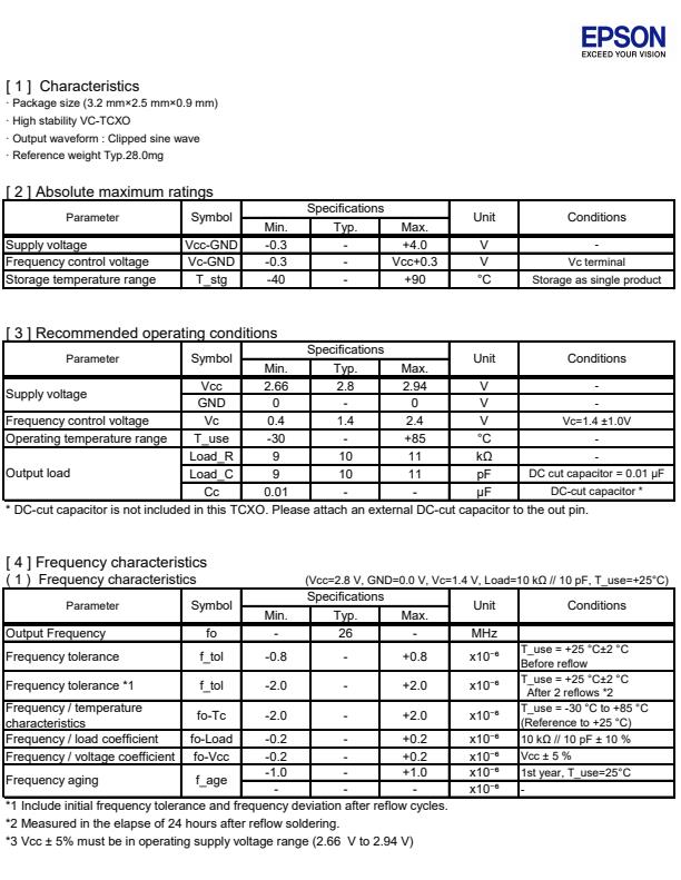 X1G004201002600 | TG-5006CE | 26.000000 MHz | 3.20 x 2.50 x 0.90 mm | 2.660 to 2.940 V | +/-2.0 ppm | -30 to +85 °C | +/-0.50 ppm |