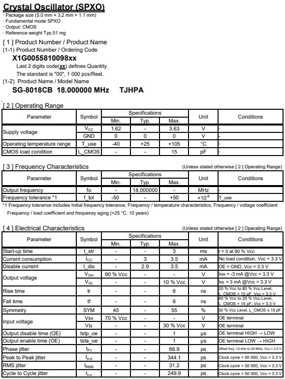 X1G005581009200 | SG-8018CB | 18.432000 MHz | 5.00 x 3.20 x 1.30 mm | CMOS | 1.620 to 3.630 V | -40 to 105 °C | +/-50 ppm |