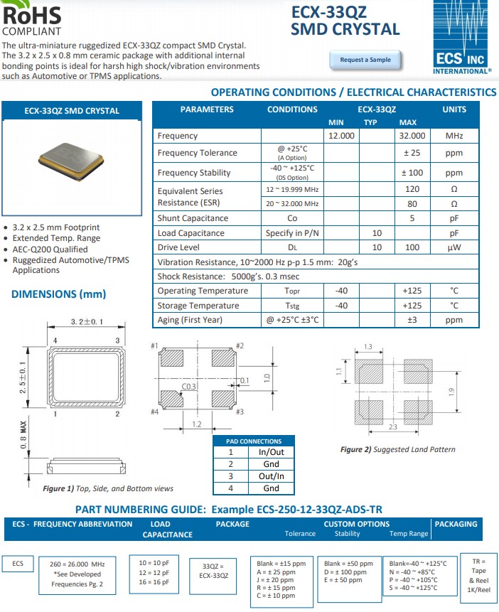 ECS-320-18-33Q-DS | ECS Crystal | ECX-33Q | 32MHz | -40°C ~ 125°C |