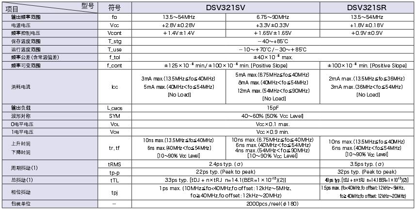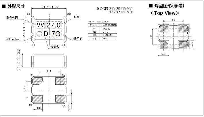 DSV321SR振蕩器:3225尺寸、厚度1.1mm、小型SMD-VCXO.雖然小型但確保充足的可變量,頻率發生線性變化的模擬類型VCXO,低消耗電流.適用于DVD、數字TV、STB、ADSL、基干傳輸用等產品.頻率范圍可達13.5~54MHZ.屬于工業級晶振.可耐高溫,經過專業檢測認證屬于無鉛環保產品. 2016、2520、3225、5032系列貼片晶振成為了市場的主流尺寸.
