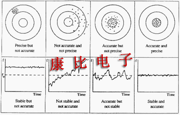 振蕩器表現出各種不穩定性.這些包括老化,噪聲和頻率隨溫度,加速度,電離輻射,電源電壓等的變化.術語精度,穩定性和精度通常用于描述振蕩器的不穩定性質量.圖1說明了射手和頻率源的這些術語的含義.(對于神射手,每個彈孔與目標中心的距離是"測量".)