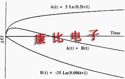 老齡化可能是積極的還是消極的[17].偶爾會觀察到老化方向的逆轉.在恒定溫度下,老化通常具有與時間近似的對數依賴性.典型的(計算機模擬的)老化行為如圖16所示,其中A(t)是對數函數,B(t)是相同的函數但具有不同的系數.顯示反轉的曲線是其他兩條曲線的總和.逆轉表明存在至少兩種老化機制.振蕩器的老化率在首次打開時最高.當晶體單元的溫度改變時(例如,當OCXO關閉并且稍后打開時),開始新的老化循環.(有關溫度循環影響的其他討論,請參閱下面有關滯后和回掃的部分.)