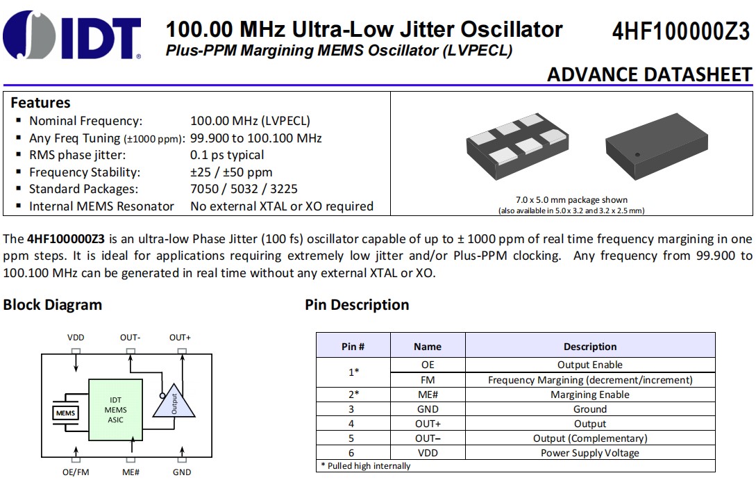 4HF100000Z3AACXGI8 | IDT晶振 | OSC MEMS 100.000MHZ LVPECL SMD | 4HF | 100MHz |