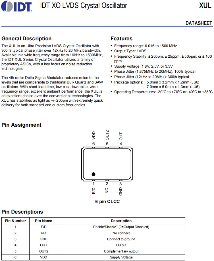 IDT石英晶體振蕩器,XUL535125.000JS6I8,6G通訊設備晶振,XUL736150.000JU6I,LVDS差分晶振,參數表