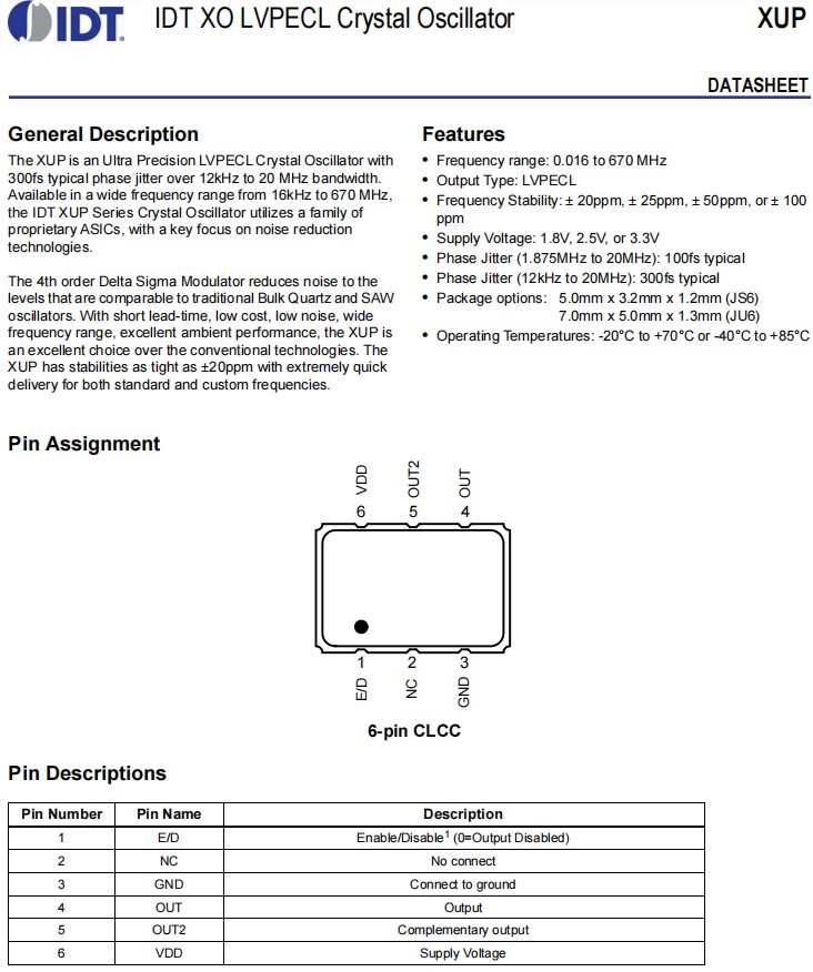 XUP536100.000JS6I | IDT晶振 | OSC XO 100.0000MHZ LVPECL SMD | XUP | 100MHz | LVPECL |