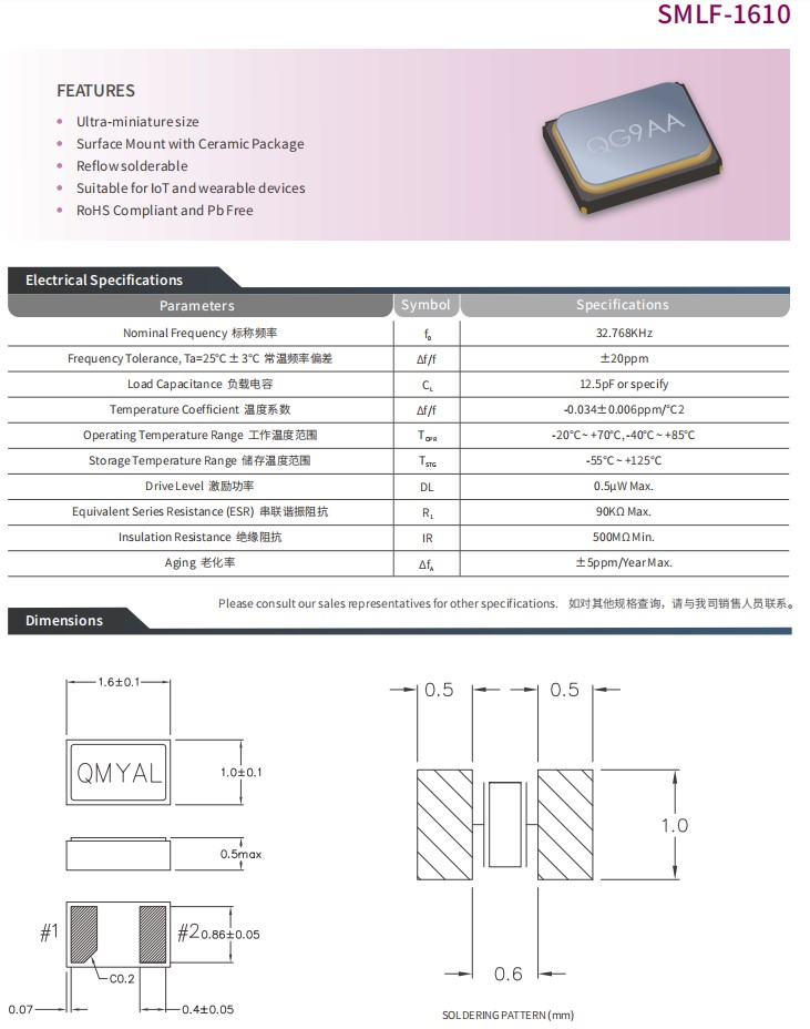 Interquip應達利晶振,SMLF-1610,32.768KHz晶振,6G儀器儀表晶振,超小型晶振,兩腳貼片晶振,參數表