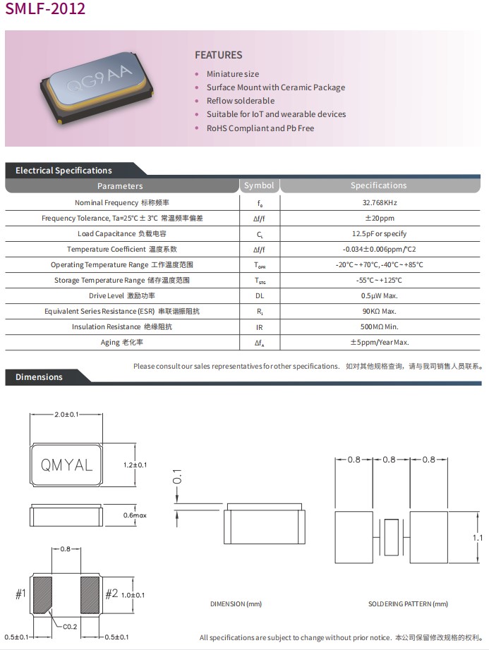 SMLF-2012,Interquip無源晶振,鐘表電子晶振,6G無線晶振,32.768K貼片晶振,可穿戴設(shè)備晶振,參數(shù)表