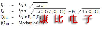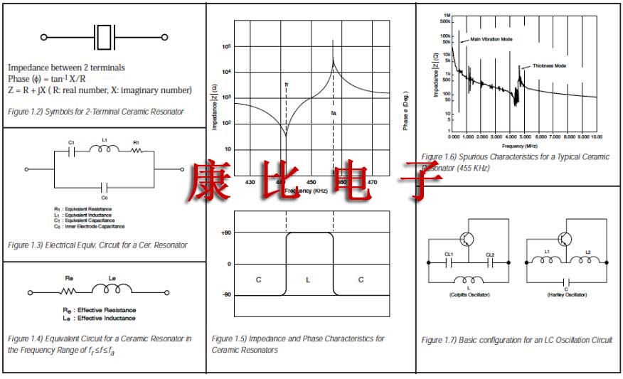 等效電路常數:圖1.2顯示了陶瓷諧振器的符號.端子間的阻抗和相位特性如圖1.5所示.該圖說明諧振器在提供最小阻抗的頻率fr(諧振頻率)和提供最大阻抗的頻率fa(反諧振頻率)之間的頻率范圍內變為電感性的.它在其他頻率范圍內變得具有電容性.這意味著雙端諧振器的機械振動可以用等效電路代替,該等電路由串聯和并聯諧振電路的組合構成,其中包括電感器L,電容器C和電阻器R.在諧振頻率附近,等效電路可以表示如圖1.4所示.fr和fa頻率由壓電陶瓷材料及其物理參數決定.等效的循環常數可以從以下公式確定: 考慮到fr<f<fa的有限頻率范圍,阻抗給定為Z=Re+jwLe(Le<=0),如圖1.5所示.陶瓷諧振器應作為具有損耗Re()的電感器Le(H)操作.圖1.1表示陶瓷諧振器和石英晶體諧振器之間等效電路常數的比較,注意,電容和Qm存在很大差異,這導致實際操作時振蕩條件的差異.附錄中的表格顯示了每種陶瓷激光器的等效電路常數的標準值.除了期望的振蕩模式之外,存在用于其他振蕩模式的高次諧波.存在這些其他振蕩模式是因為陶瓷諧振器使用機械??共振.圖1.6顯示了這些特征.