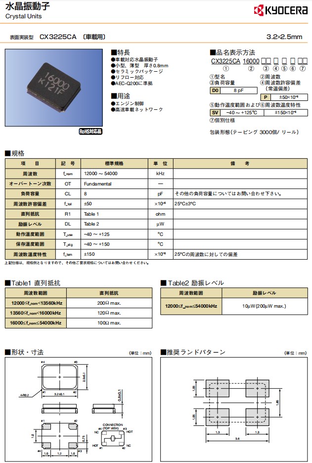CX3225CA28636D0HSSCC|3225mm|28.63636MHz|8pF|符合AEC-Q200,日本進(jìn)口晶振,Kyocera京瓷晶振,型號(hào)CX3225CA,編碼為:CX3225CA28636D0HSSCC,是一款小體積晶振尺寸3.2x2.5x0.8mm陶瓷封裝,陶瓷諧振器,四腳貼片晶振,無源晶振,石英晶體諧振器,車載對(duì)應(yīng)石英振子,SMD晶振,耐高溫晶振,無鉛環(huán)保晶振,頻率為:28.63636MHz,工作溫度范圍:-40℃至+125℃,石英晶振具有超小型晶振、輕薄型晶振、耐熱、耐振、耐沖擊等優(yōu)良的耐環(huán)境特性,滿足無鉛焊接的高溫回流溫度曲線要求,符合AEC-Q200標(biāo)準(zhǔn)。應(yīng)用于:汽車電子設(shè)備,發(fā)動(dòng)機(jī)控制,高速車載網(wǎng)絡(luò),車載控制器晶振,汽車動(dòng)力轉(zhuǎn)向控制器晶振,汽車胎壓檢測(cè)專用晶振,通訊設(shè)備晶振,無線網(wǎng)絡(luò)晶振,藍(lán)牙模塊等應(yīng)用。