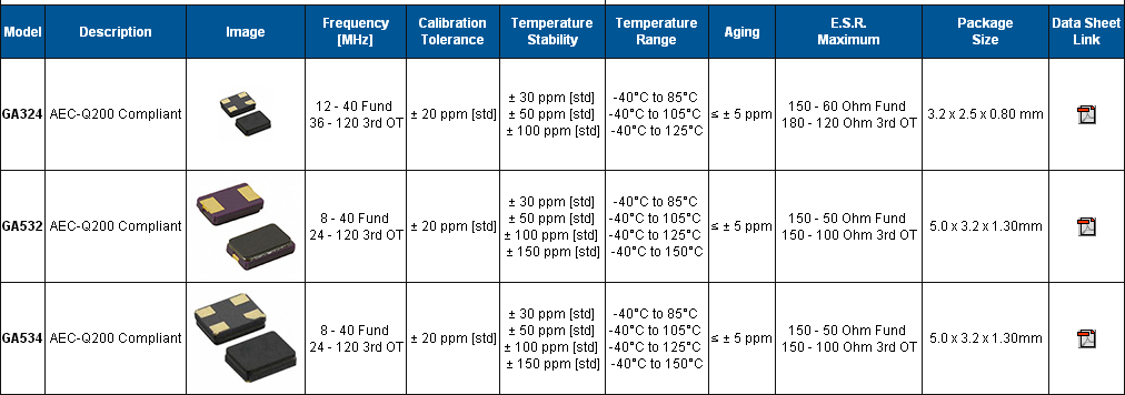 頻率公差@ 25°C | ±10ppm, ±15ppm, ±20 ppm, ±30 ppm, ±50 ppm | ||||