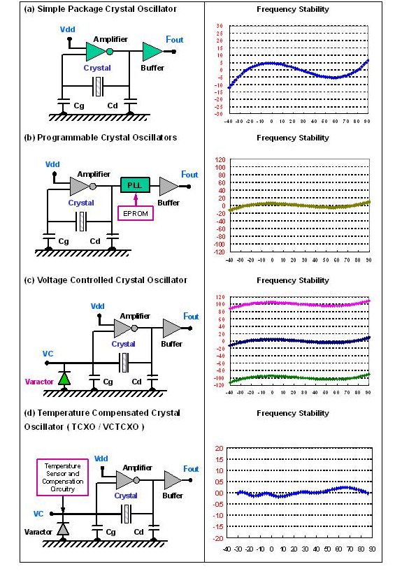 當把石英共振子與振蕩線路或集成電路(IC)一起整合在一個封裝內, 由外部提供電源電壓, 形成一個主動組件輸出頻率信號, 就是所謂的石英晶體振蕩器. 石英晶體振蕩器可以藉由單一封裝組件內部不同的振蕩線路及輸出線路, 提供不同特性需求的參考頻率(reference frequency). 例如有 石英頻率振蕩器SPXO ( Simple Package Crystal Oscillator ) 或稱為 CXO ( Clock Crystal Oscillator ), 可程序化石英晶體振蕩器PCXO ( Programmable Crystal Oscillator ), 電壓控制石英晶體振蕩器VCXO ( Voltage Controlled Crystal Oscillator ), 溫度補償石英晶體振蕩器TCXO ( Temperature Compensated Crystal Oscillator ) 及 恒溫槽控制石英晶體振蕩器OCXO ( Oven Controlled Crystal Oscillator ).
