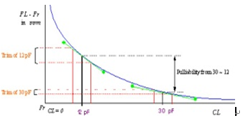 晶體頻率與負載電容的變化要求:請測量使用示波器或頻率計數器晶體的兩個端子的信號,如果頻率不在規定范圍內,它的輸出波形的幅度是不夠的(例如超過+/-200ppm的).The formula for Capacitances versus Frequency is as following:該公式的電容與頻率是如下: FL = FR * (1 + C1 / 2 * (C0 + CL) ) where該曲線代表電容變化與頻率變化(頻率pullability)變化的變化: