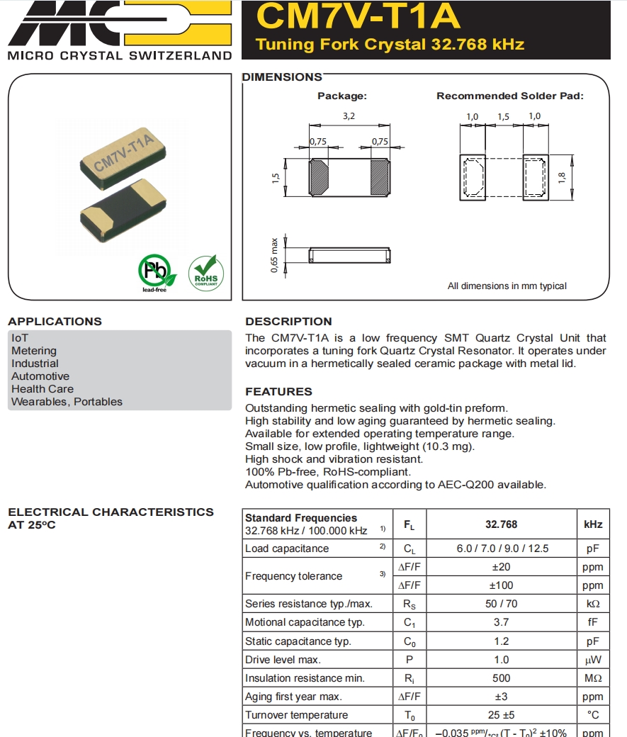瑞士微晶3215晶振,計量6G晶振,CM7V-T1A-32.768kHz-12.5pF-100PPM-TB-QC 參數表