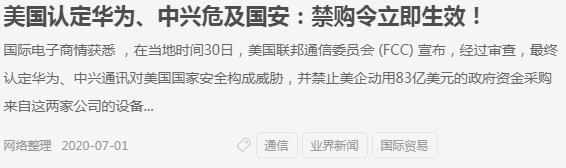 美國政府每年有84.98億美元的通用服務基金被用于補貼美國的寬帶部署和服務.2019年11月,美國聯邦通信委員會官網刊發一份一致投票,以5比0的投票結果發布了這一聲明:禁止華為和中興的設備出現在FCC的通用服務基金資助項目中的文件,華為,中興的網絡設備在美國被 限制,相當于少了這款銷售點,當地也少了中間賺其的費用,兩大公司受到限制,不單單是網絡設備售賣不出去,手機內的元器件,石英晶振,溫補振蕩器,電池,手機殼也是為用武之地.FCC主席Ajit Pai周二的聲明中說:網絡安全就是國家安全,今日行動將有助于保護我們的網絡免受來自華為和中興設備的新威脅,我們不能也不會允許中國利用網絡漏洞并危及我們的關鍵通信基礎設施.