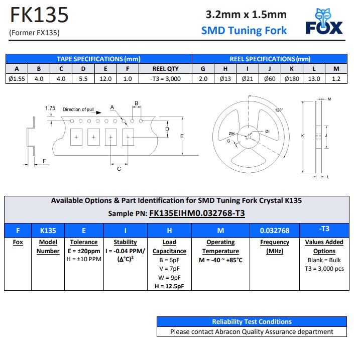 FX135A-327 | FOX晶振 | FX135A | kHz Crystal (Tuning Fork) | 32.768kHz | - |