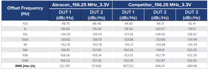 不是我 認為,競爭對手的解決方案基于倒置臺面晶體技術,不采用AX3家族的第三泛音晶體架構.此外,競爭對手設備內部的有源電路顯示出偏離載波10千赫至1千赫之間的大約-135分貝/赫的閾值.這一限制有助于降低目標帶寬(12千赫至20兆赫)上的均方根抖動性能.