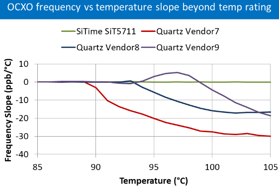 下面,我們表明ΔF/Δ?相同的從85四個工業(yè)級OCXO設(shè)備°C到125°C的頻率斜率的石英器件的劣化達(dá)到30ppb的/°C.相反,MEMS振蕩器的基于SiT5711的OCXO可保持額定穩(wěn)定性,最高可達(dá)+105°C,斜率小于0.5ppb/°C.