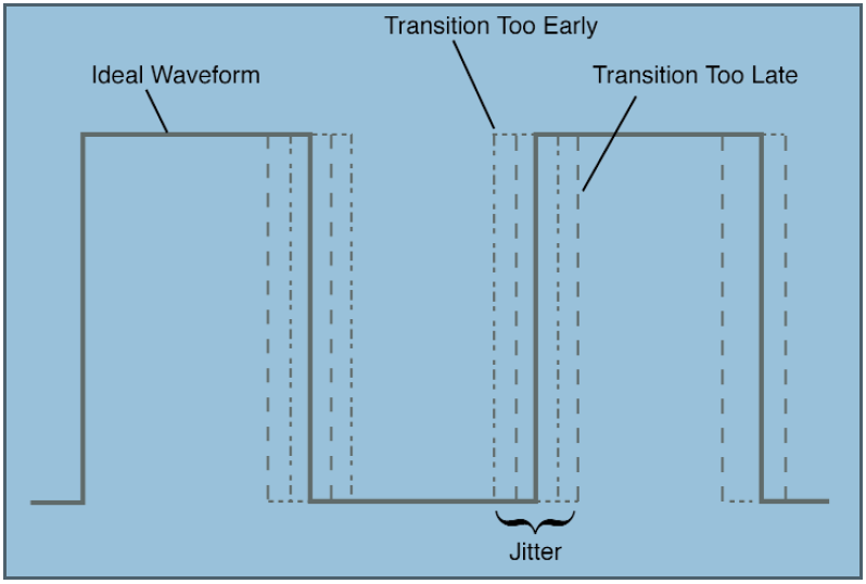 從這個測量中,我們可以看到石英晶體振蕩器的瞬時頻率不是恒定的——它與標稱頻率相差很小,在任何給定的時間點都會造成頻率的不確定性.這種頻率變化可以被視為波形邊緣相對于理想標稱頻率邊緣的時間變化.邊緣的這種時間變化稱為抖動.圖1說明了方波的抖動效應.