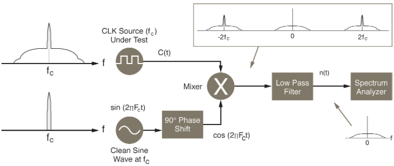 測量相位噪聲并非易事.大多數頻譜分析儀沒有直接測量晶體振蕩器相位噪聲的分辨率.圖3顯示了相位噪聲測試的正常配置.與被測振蕩器頻率相同的“理想”源與振蕩器混合.這產生了這兩個信號的乘積,也產生了差異.使用低通濾波器,如果“理想”源與振蕩器的頻率完全相同,產品將被剝離,只留下差異,這將是振蕩器噪聲.