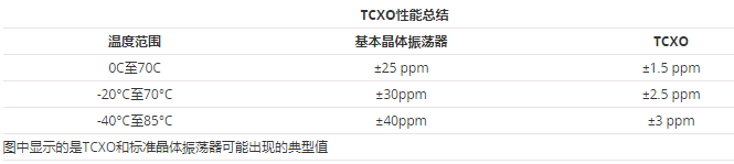 溫度的影響在很大程度上是可重復和可定義的.因此,可以使用溫度補償晶體振蕩器TCXO來補償許多效應.典型或預期性能水平的典型比較如下表所示: