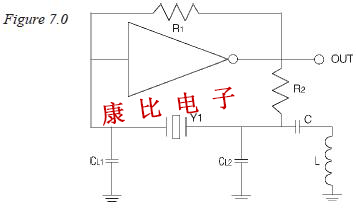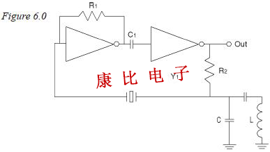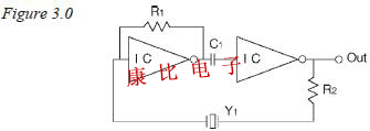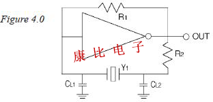 電阻器R1和R2具有與圖3.0所示串聯諧振電路相同的功能.兩個負載電容CL1和CL2用于確定晶體單元以及振蕩器的工作頻率.晶體單元Y1是并聯諧振晶體單元,被指定以負載電容的指定值,期望的頻率以及期望的頻率容限和穩定性工作.